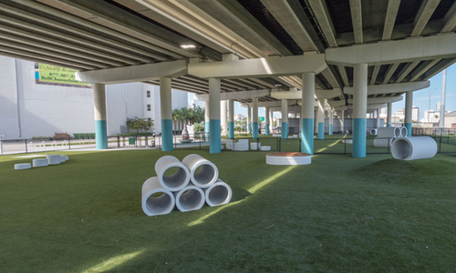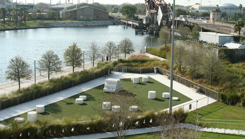 Tampa Hillsborough Expressway Authority dedicated this dog park, located underneath the Selmon Expressway behind the Bell Channelside Apartments as a memorial to Deputy John Robert Kotfila, Jr. who lost his life to a wrong-way driver on the Lee Roy Selmon Expressway after they learned of his strong bond with his German Shepard, Dexter. There is plenty of room for dogs of all sizes to socialize, with separate play areas for small and large dogs. The park is installed with canine turf, which is safer for puppy paws, requires less maintenance and is more durable. Other elements include water fountains with built-in pet bowls and large bench-style seating throughout the park. This is all under the shade of the Selmon Expressway. Open sunrise to sunset.
